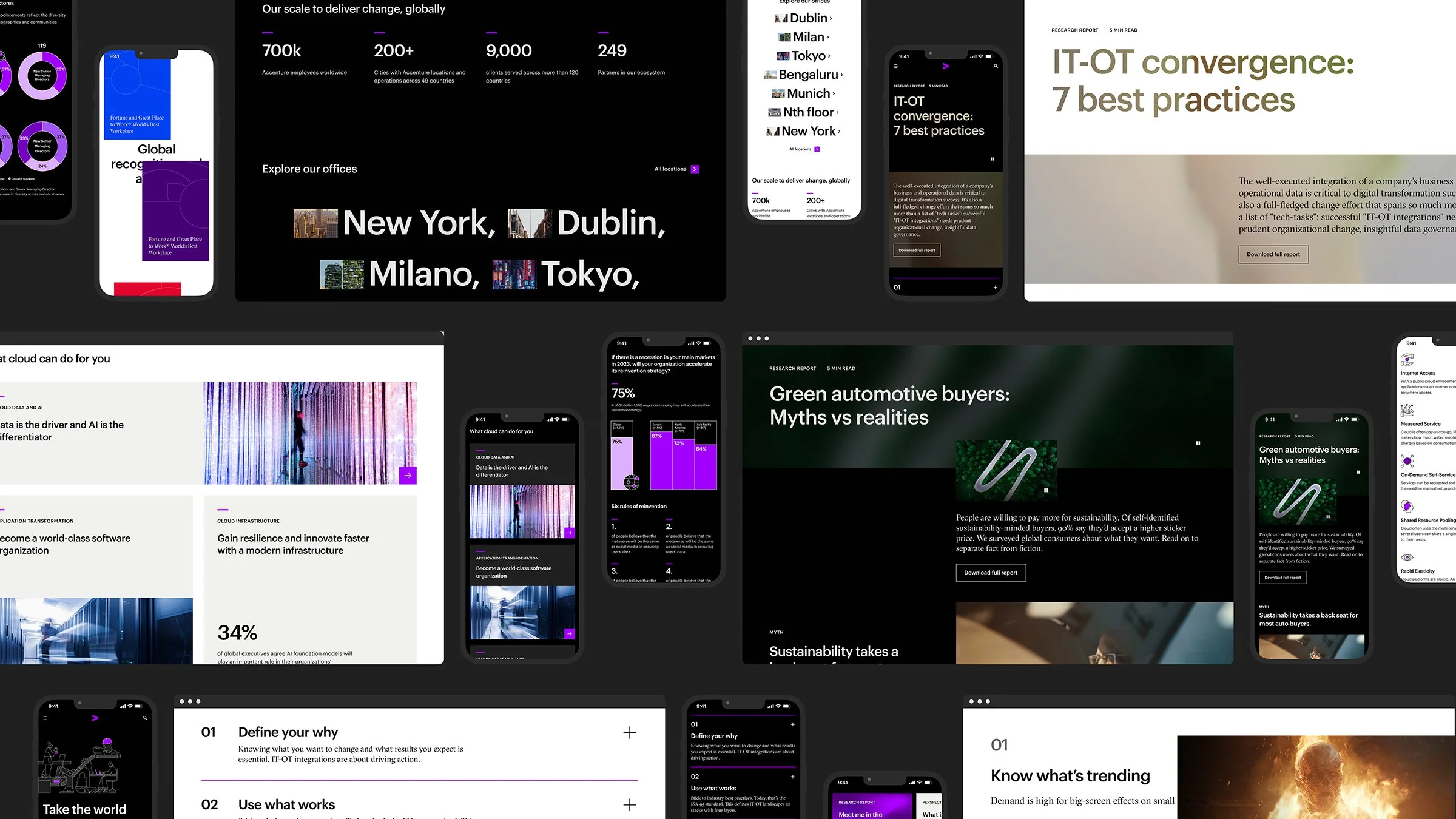 Rooted in Accenture's original motion style, that bring the emotional connection, that makes the website alive. We created a consistent choreography for components and interactions—from functional buttons, expressive page transition, to kinetic elements. The website experience works in harmony.