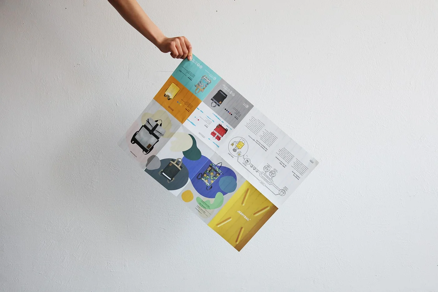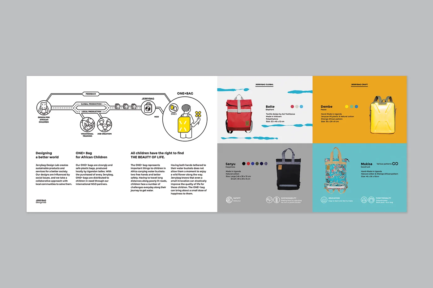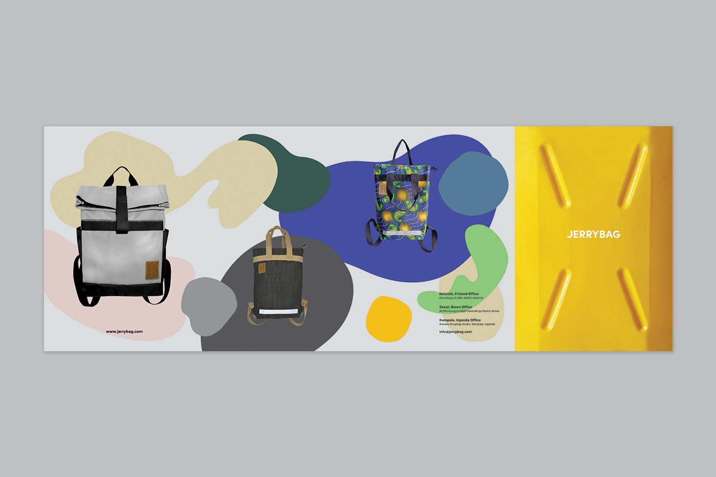 Jerrybag Design Lab is a social enterprise that creates sustainable products and services for a better society. A yellow water bucket (Jerrycan), which is a plastic container frequently used in developing countries to transport and store drinking water, relates the identity to the starting point of Jerrybag Design Lab's journey and the core of their inspiration.