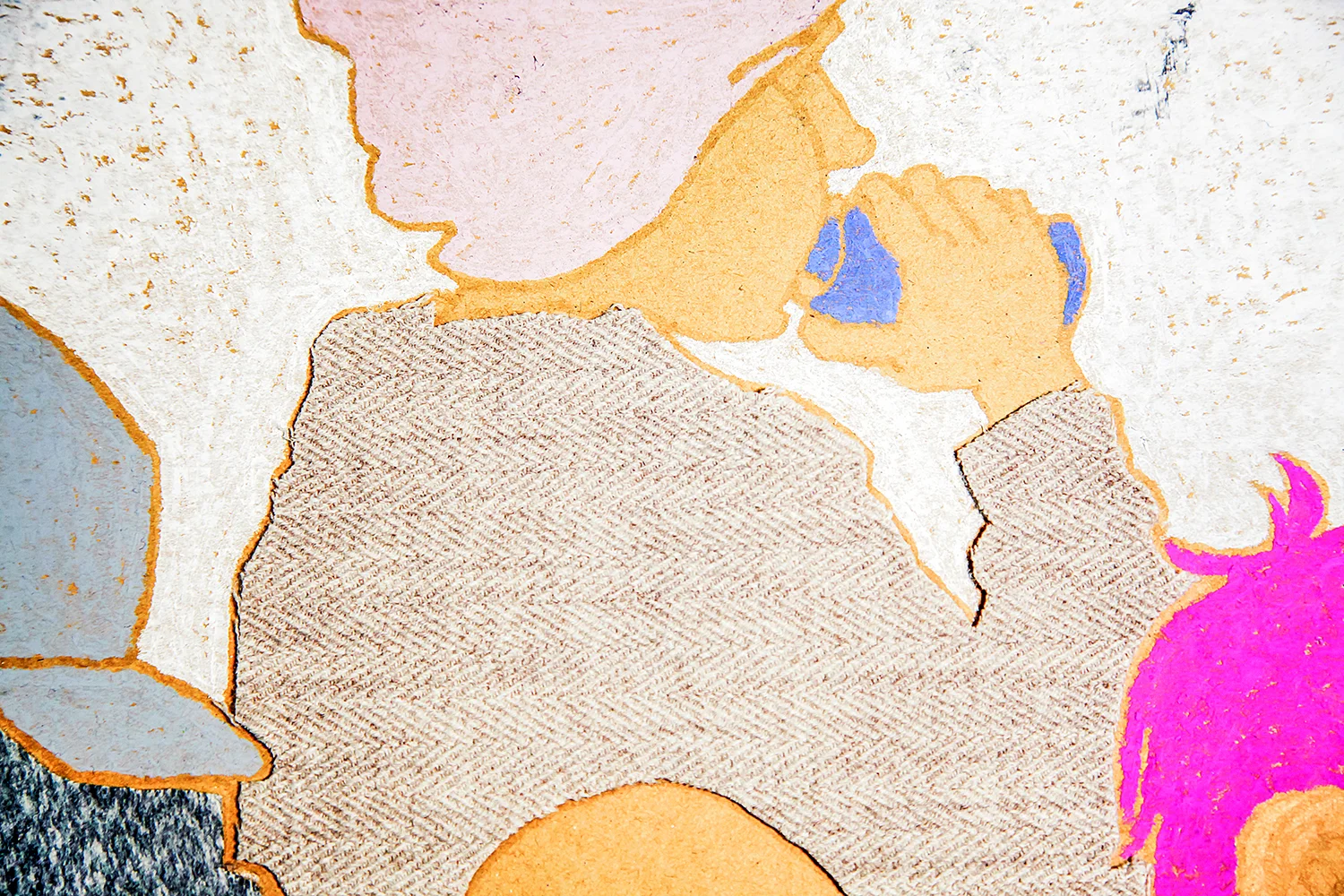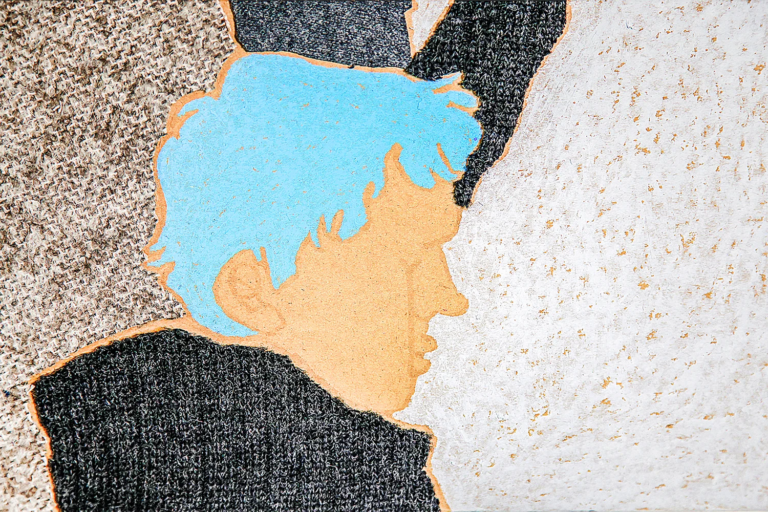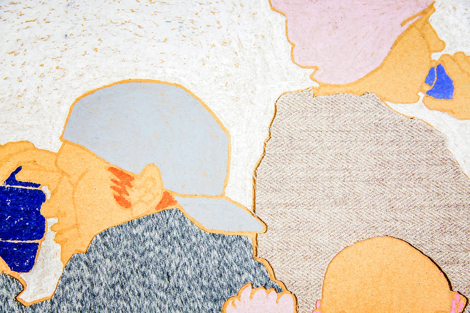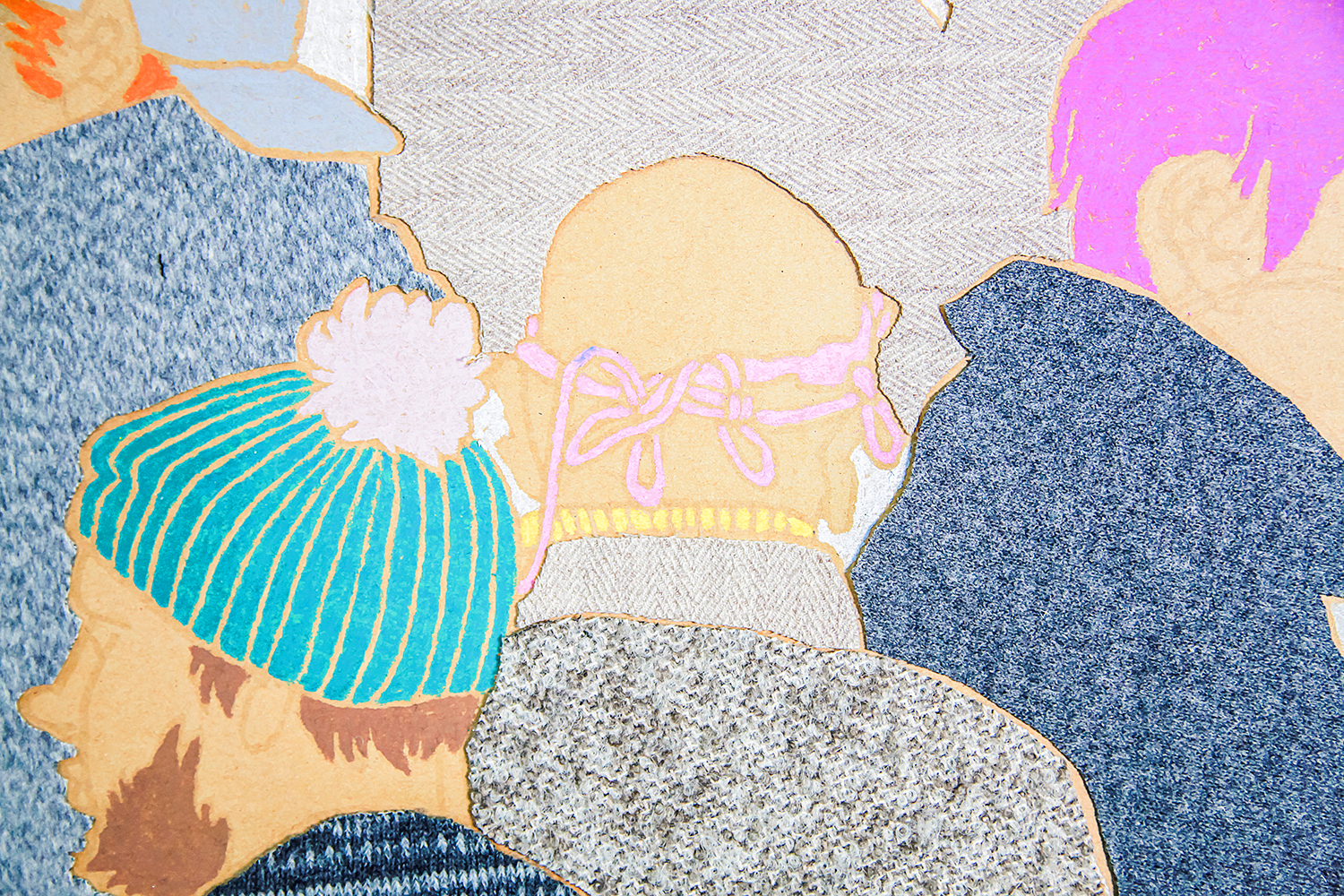 These works were implemented with ordinary materials, such as children's crayons and craft paper, creating the texture of roughness through roughly painted blocks of colours. In particular, the street scene can be felt tactually by means of wool fabrics which remind of Icelandic national product and gives the mood of a cold climate. Also, the translucent lines evoke the feelings of openness in order for each figure to breathe.